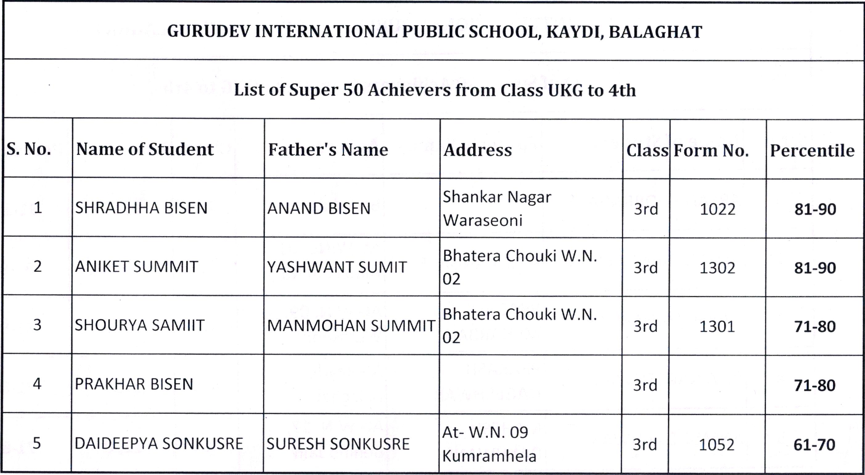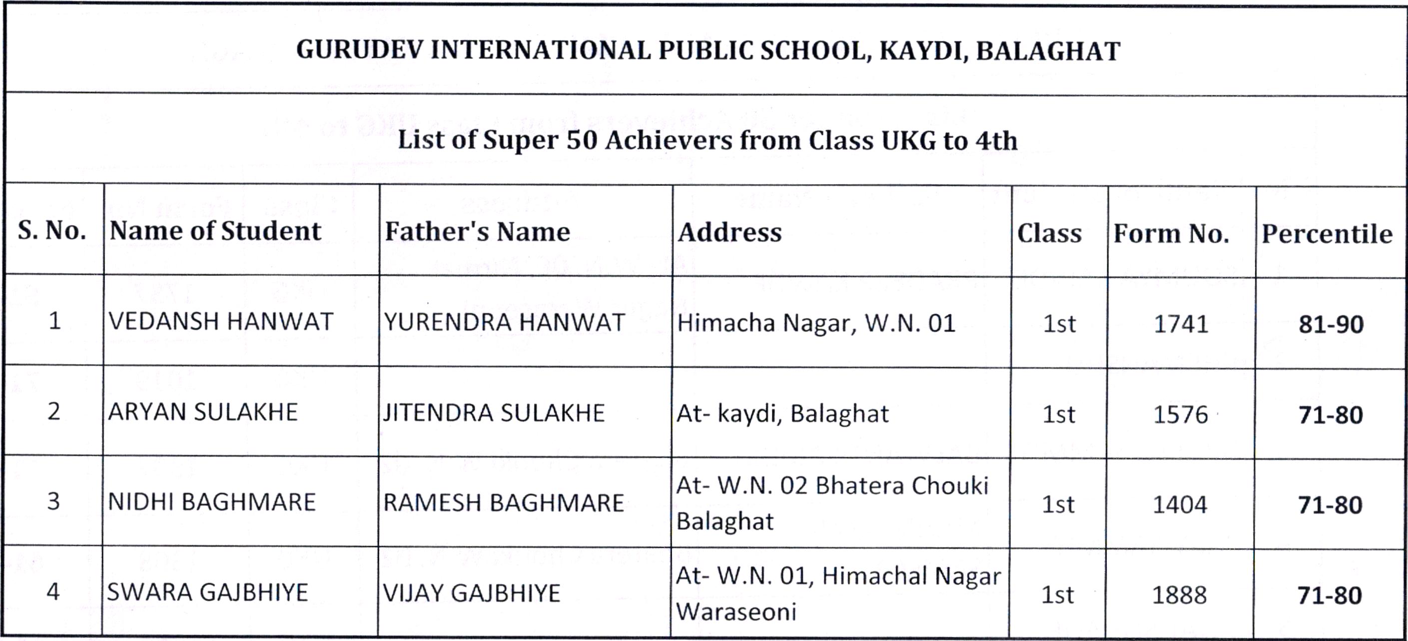 GURUDEV TALENT HUNT RESULTS (PHASE - 2) 2017-18 CLASS - 1st