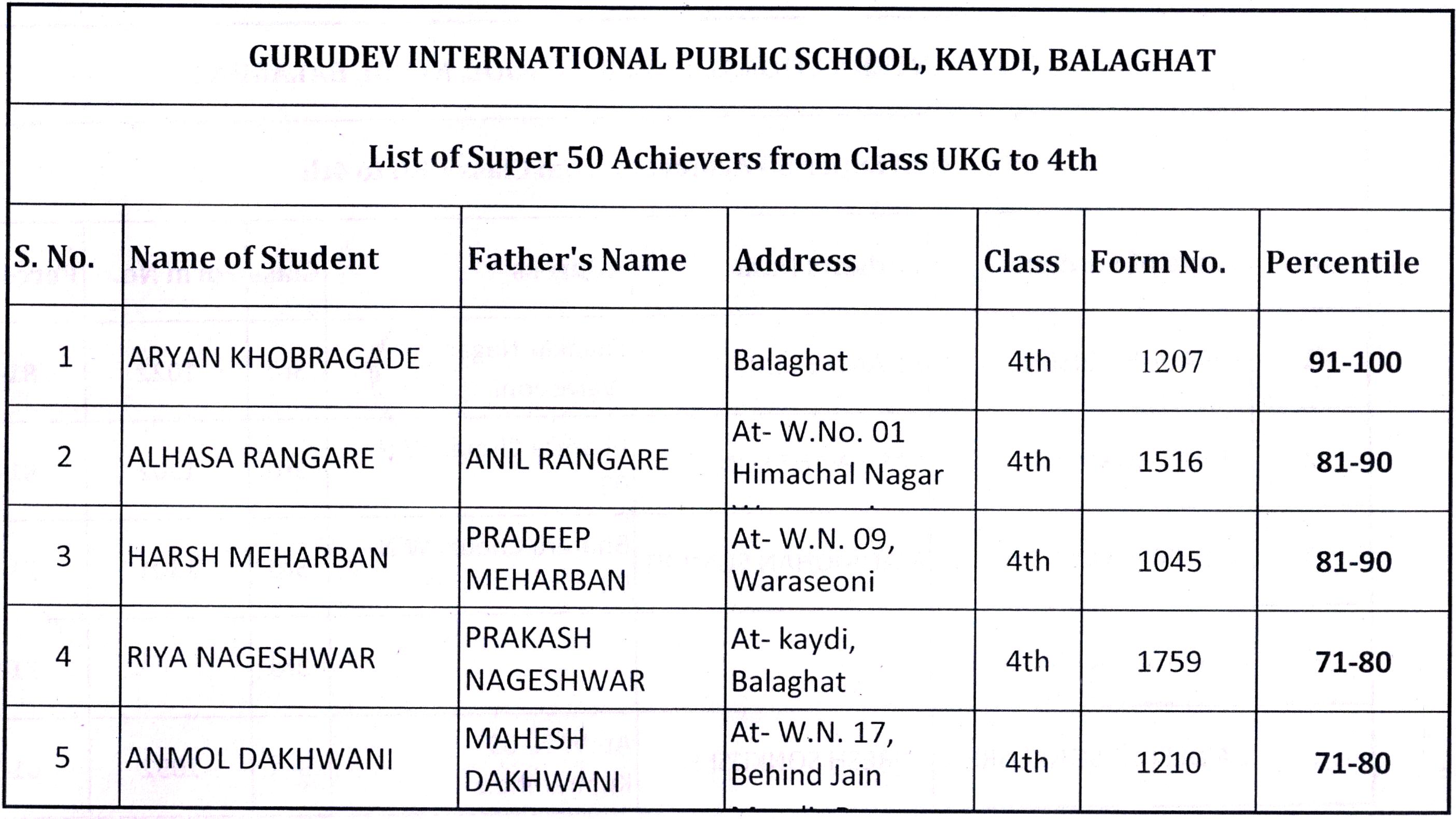 GURUDEV TALENT HUNT RESULTS (PHASE - 2) 2017-18 CLASS - 4th