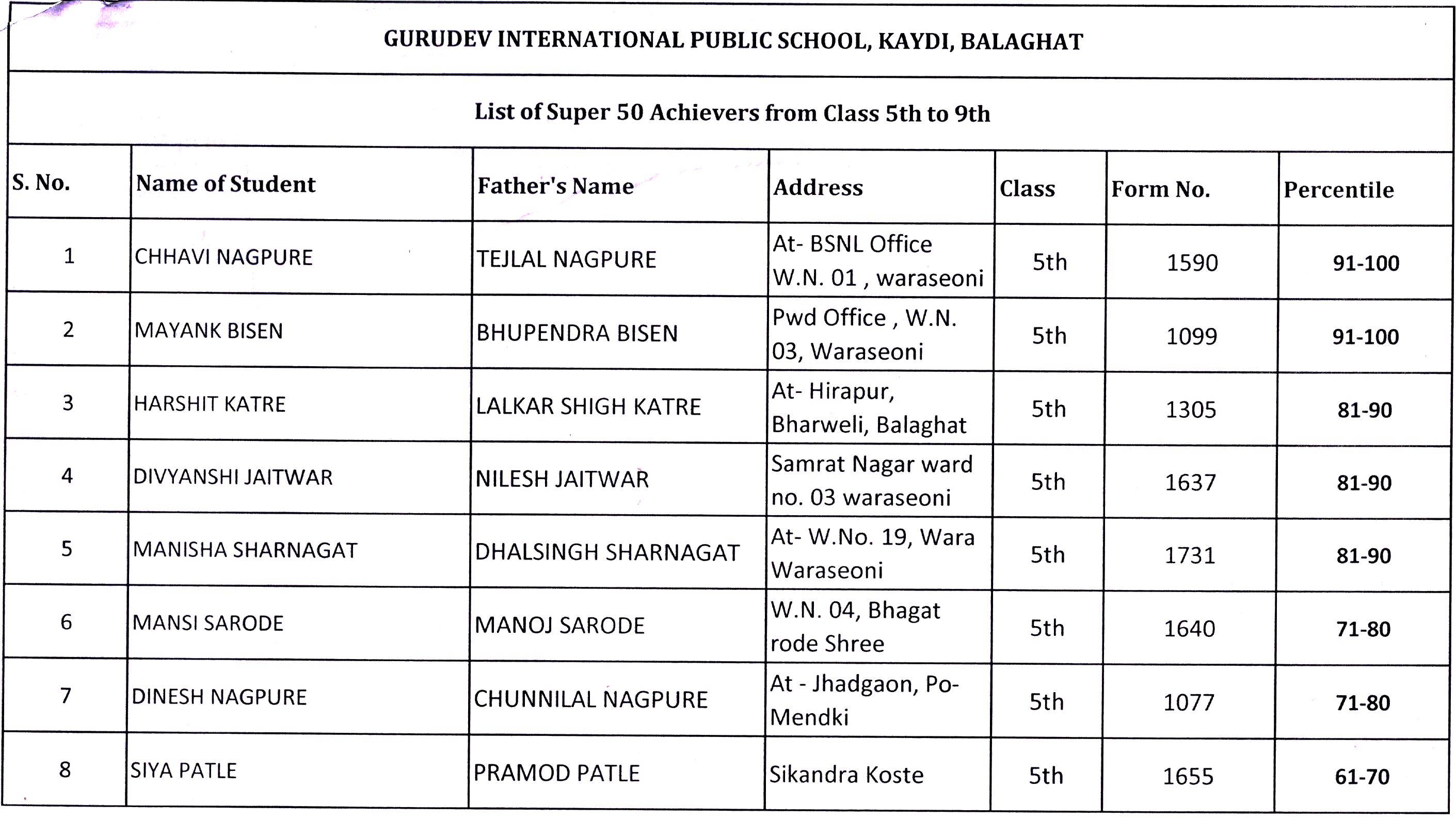 GURUDEV TALENT HUNT RESULTS (PHASE - 2) 2017-18 CLASS - 5th
