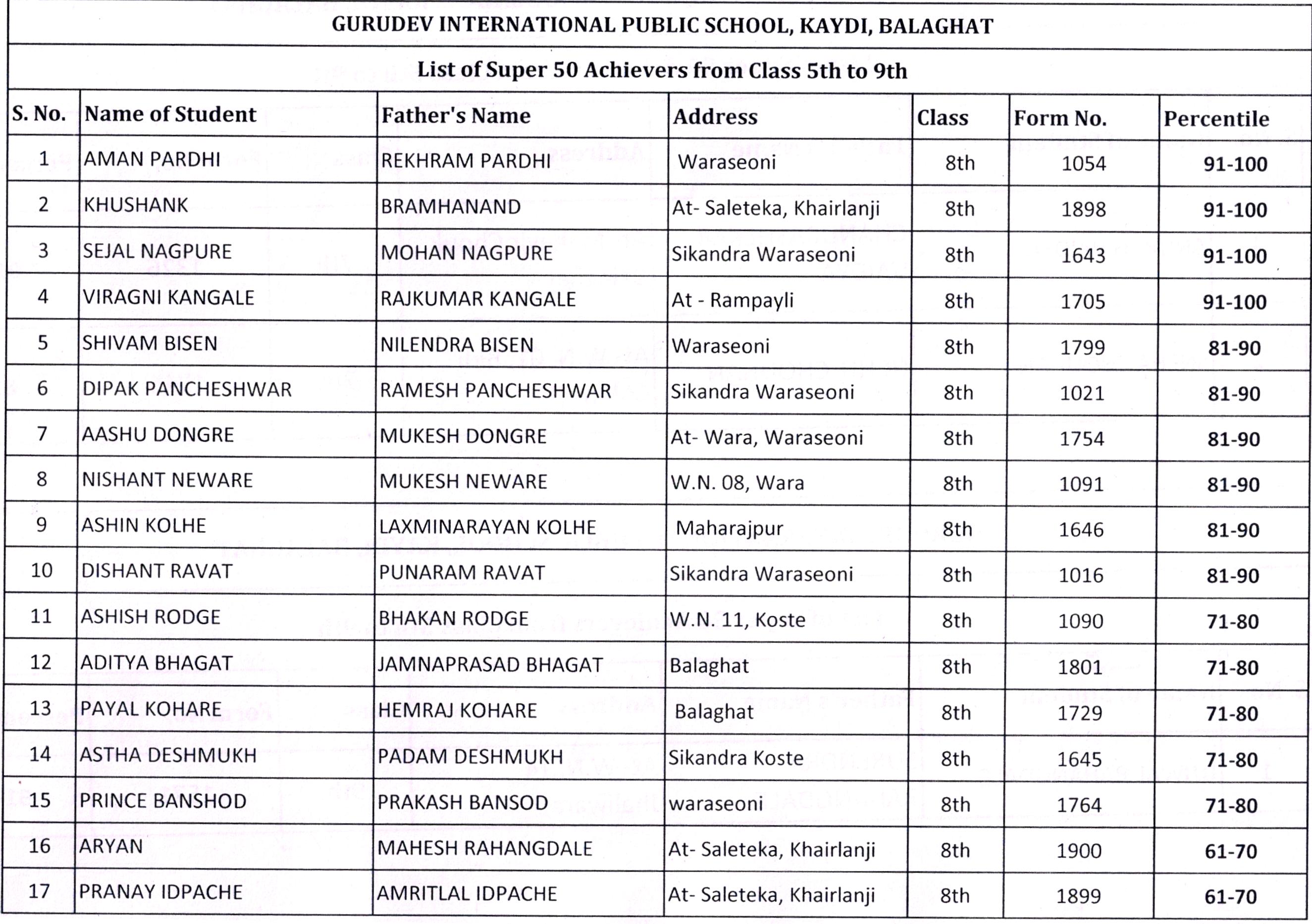 GURUDEV TALENT HUNT RESULTS (PHASE - 2) 2017-18 CLASS - 8th